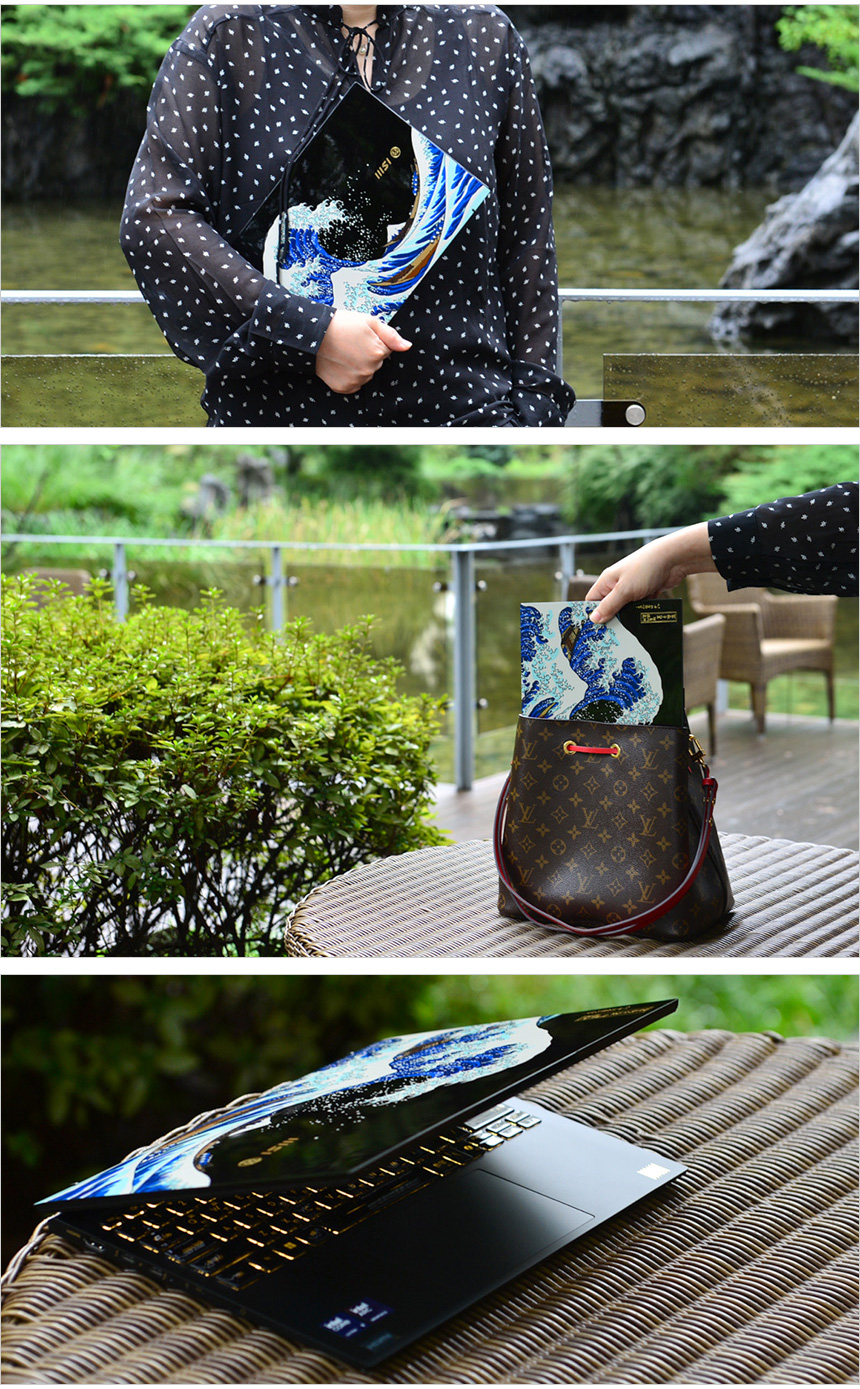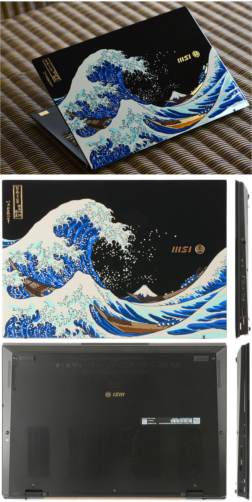 전세계 2,000대만 한정 판매되는 MSI 프레스티지 13 AI+ 우키요에 에디션 A2VMG-U9 2.8K OLED WIN11 은 일본 미술사에서 가장 상징적이고 사랑받는 작품 중 하나인 [가나가와 해변의 높은 파도아래]를 숙련된 장인이 수작업으로 제작했다. 400년 전통 야마나카 옻칠으로 적용하고 여러번의 인쇄 과정을 통해 그림이 프린팅된 일반 노트북과 달리 특유의 질감을 느낄 수 있다.