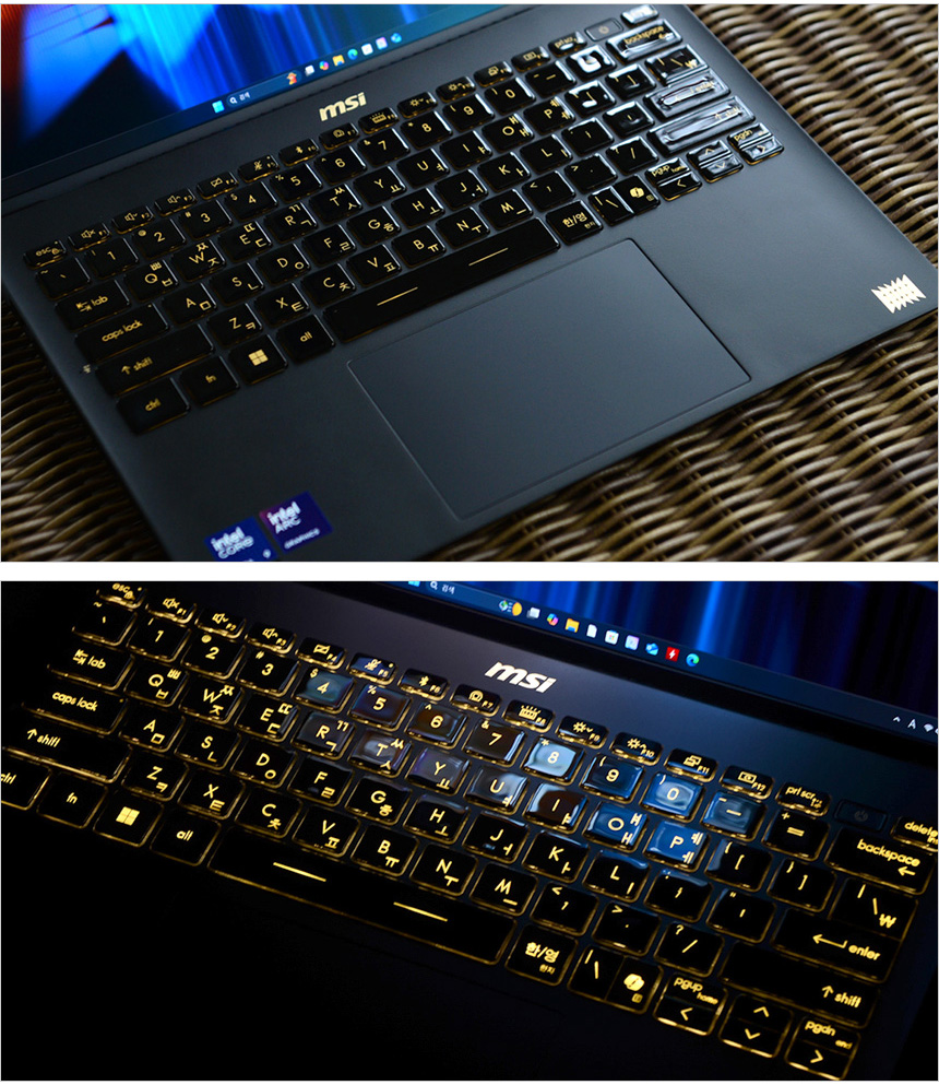 키보드의 모습으로 13.3형 컴팩트 노트북 답게 텐키리스 방식의 치클릿 키보드가 장착된 것을 확인할 수 있다. 도입부에서 언급한 것과 같이 피아노 광택 키캡을 적용했을 뿐만 아니라 골드 컬러의 LED 백라이트를 지원해 디자인 만족감을 한층 높였다. (야간에도 편하게 노트북을 사용할 수 있다.)