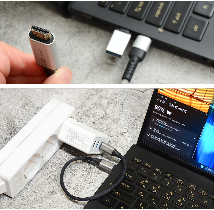 썬더볼트4 단자는 빠른 데이터 전송이 가능하며 디스플레이 출력을 지원해 모니터를 연결해 사용할 수 있다. 또한 A타입 젠더를 장착하면 일반 주변기기 연결도 가능하며 PD충전 기능을 제공해 손쉽게 전원을 공급할 수 있다.