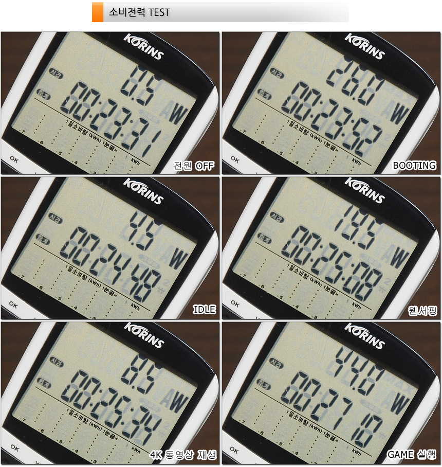 소비전력 테스트를 진행하고 있는 모습으로 (최고 성능 모드) 캐주얼한 작업에서는 10~30W 대의 소비 전력으로 보여주었으며 영상편집이나 게임 실행시에는 50W 까지 소비전력이 올라가는 것을 확인할 수 있다. (게임 실행시 40W 대를 유지했으며 벤치마크나 랜더링 작업시에는 50W 이상으로 소비전력이 올라갔다.)