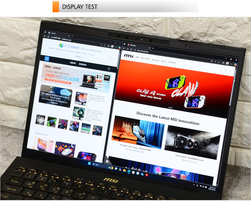 타이핑 테스트를 진행하고 있는 모습으로 컴팩트 노트북이지만 넓은 키간격으로 여유롭게 고속 타이핑을 진행할 수 있으며 드롭 힌지를 적용한 노트북 답게 자연스럽게 손을 올려두고 타이핑 할 수 있었다. 키압고 낮고 통통 튀는 확연한 피드백을 제공해 눈으로 확인하지 않고 오타없는 고속 타이핑이 가능했다. 또한 손을 올려둘 수 있을 정도로 팜래스트가 넓어 장시간 사용시 손목등의 피로감은 크지 않았다.