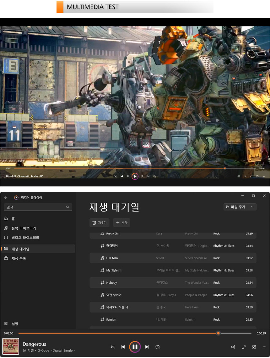 또한 MP3 파일을 이용해 스피커 테스트를 진행하고 있는 모습으로 돌비 애트모스 기술이 적용된 모델답게 높은 출력으로 시원시원한 사운드를 즐길 수 있으며 중고음 뿐만 아니라 저음 재생력도 뛰어나 귀를 자극하지 않는 자연스러운 소리를 즐길 수 있었다.