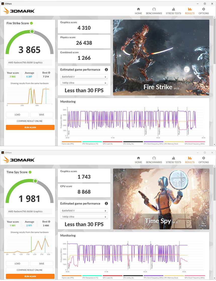 3DMARK를 이용해 3D 성능을 확인하고 있는 모습으로 가벼운 3D 게임은 실행할 수 있는 스코어를 보여주었다.