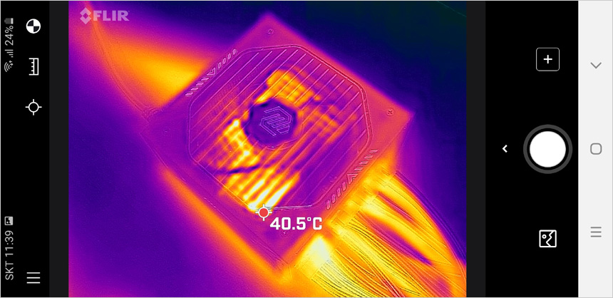 벤치 실행시 표면온도를 열화상 카메라로 확인한 모습으로 (실내온도 21도) 온도가 높은 CPU나 그래픽카드, 메인보드 전원부 등과 달리 파워 서플라이 온도는 상당히 낮은 것을 확인할 수 있다 또한 팬소음도 확인했는데 (수랭쿨러와 그래픽카드 소음 때문에 귀를 가까이 대고 테스트를 진행했다.) 거의 들리지 않았다. 어떤 환경에서도 파워서플라이 소음으로 인한 불편은 느끼지 않을 것이다.