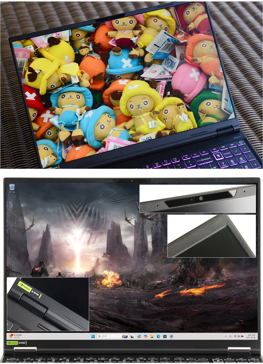 sRGB 100% 색영역 지원으로 게임용 뿐만 아니라 디자인 등의 작업용 노트북으로도 활용할 수 있으며 안티글레이 타입을 적용해 반사로 인한 스트레스 없이 게임에 집중할 수 있다. 3면 슬림 베젤을 적용해 몰입감을 높였으며 테두리에 디스플레이 범퍼가 설치되어 충격 등으로부터 패널을 보호한다. 뿐만 아니라 상단 중앙에는 FHD 웹캠과 마이크가 설치되어 화상회의나 셀프촬영 등의 용도로 활용할 수 있다.