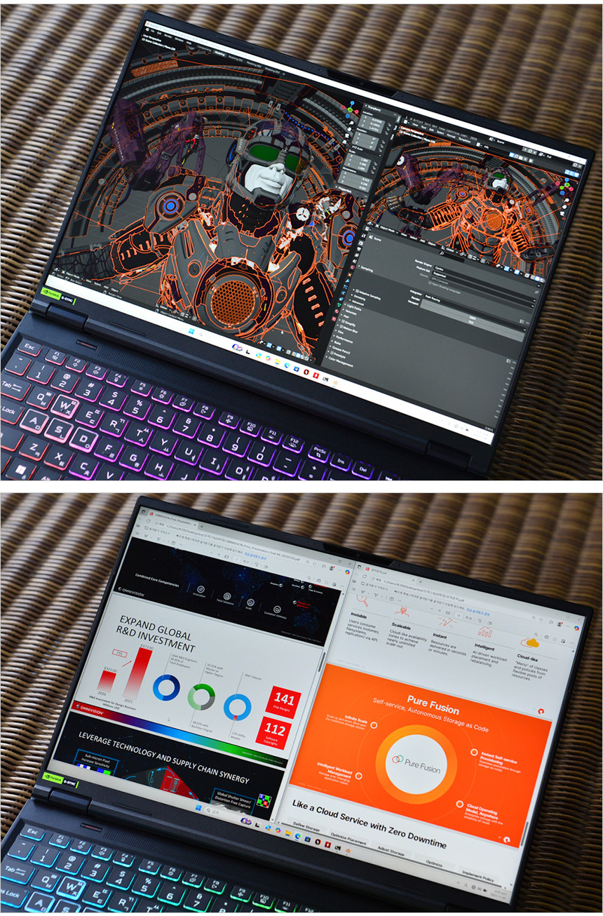 32GB 메모리를 기본 지원하는 것도 칭찬하고 싶다. 경쟁 모델들이 16GB를 듀얼로 구성하는데 반해 이 제품은 32GB 듀얼채널로 구성되어 더 쾌적하게 게임을 즐길 수 있었으며 작업속도도 상당히 빠른 것을 확인할 수 있었다. (인코딩 속도는 최상급 노트북과 비슷한 수준이었다.)