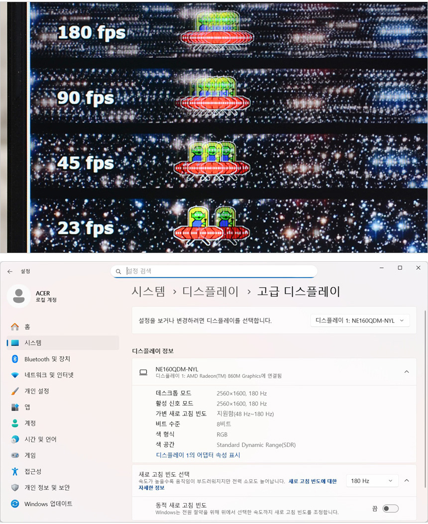 144Hz 주사율을 지원하는 보급형 게이밍 노트북과 달리 180Hz 주사율을 지원해 움직임을 정확하게 확인하고 빠르게 대응해야 하는 FPS 게임에서 특히 유용하게 사용할 수 있다. 상단의 사진은 하위 주사율과 180Hz 주사율을 비교한 모습으로 (카메라 셔터스피드를 1/20으로 설정하고 촬영) 초당 최대 180장의 장면을 보여주어 더 많은 캐릭터가 겹쳐진 것을 확인할 수 있다. 실제 눈으로 볼때에는 훨씬 자연스럽게 UFO가 이동한다.