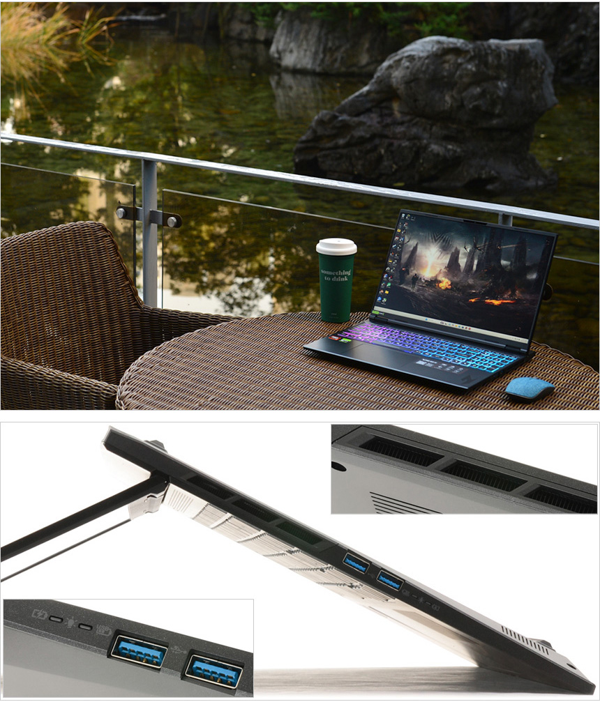 노트북 바닥면의 모습으로 차가운 공기가 원활하게 내부로 유입될 수 있도록 상단에 통풍구가 설치되어 있으며 사방에는 미끄러짐 방지를 위해 두꺼운 고무패드가 부착되어 있다. 또한 하단 양 측면에는 스피커가 설치되어 퀄리티 높은 사운드를 즐길 수 있다.