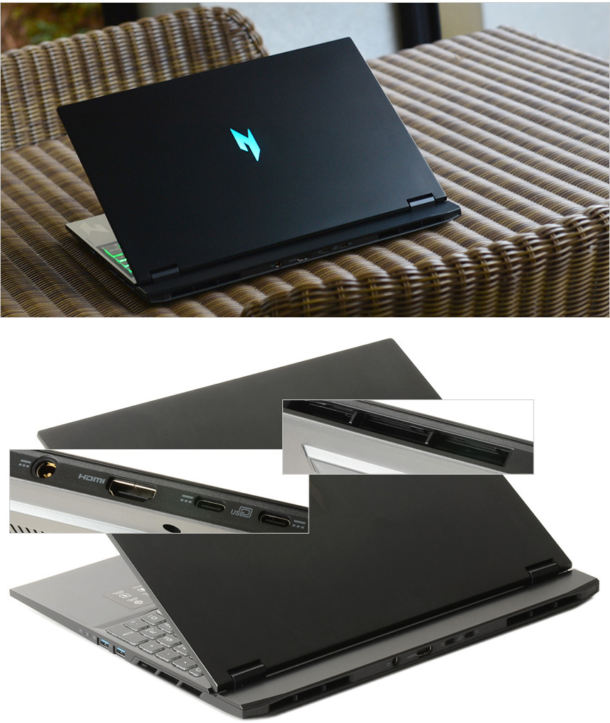 노트북 후면부의 모습으로 양 측면에 통풍구가 설치되어 있고 중앙에는 전원 단자와 HDMI 2.1 단자, 2개의 USB 4 단자가 설치된 것을 확인할 수 있다.