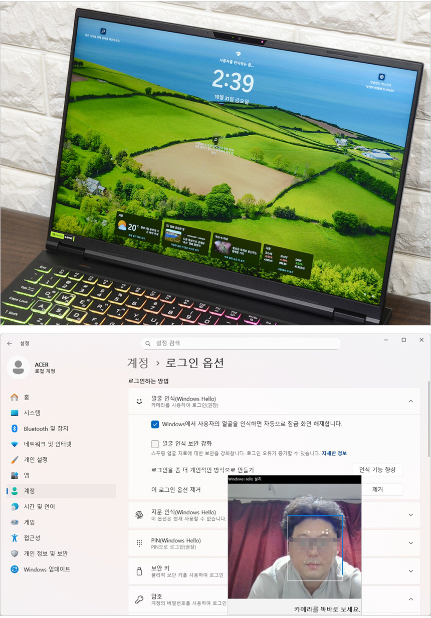 얼굴인식 로그인을 사용할 수 있다. 설정-계정에 있는 로그온 옵션에서 윈도우즈 헬로를 실행해 얼굴을 등록할 수 있으며 인식율도 뛰어나 어떤 환경에서도 편하게 사용할 수 있다. (비즈니스 노트북으로도 적합한 모델이다.)