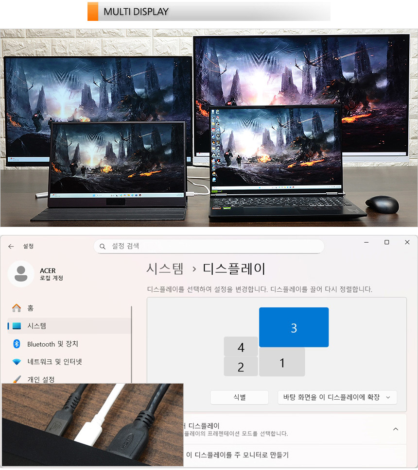 HDMI와 2개의 C타입 단자도 디스플레이 출력을 지원해 3개의 모니터를 추가할 수 있다. 상단의 사진은 3개의 모니터를 노트북에 연결한 모습을 정상적으로 작동했다. (엔비디아 그래픽 모드에서는 C타입 단자가 디스플레이 출력을 지원하지 않는다. 다중 모니터 연결이 필요하다면 옵티머스 모드로 설정하기 바란다.)
