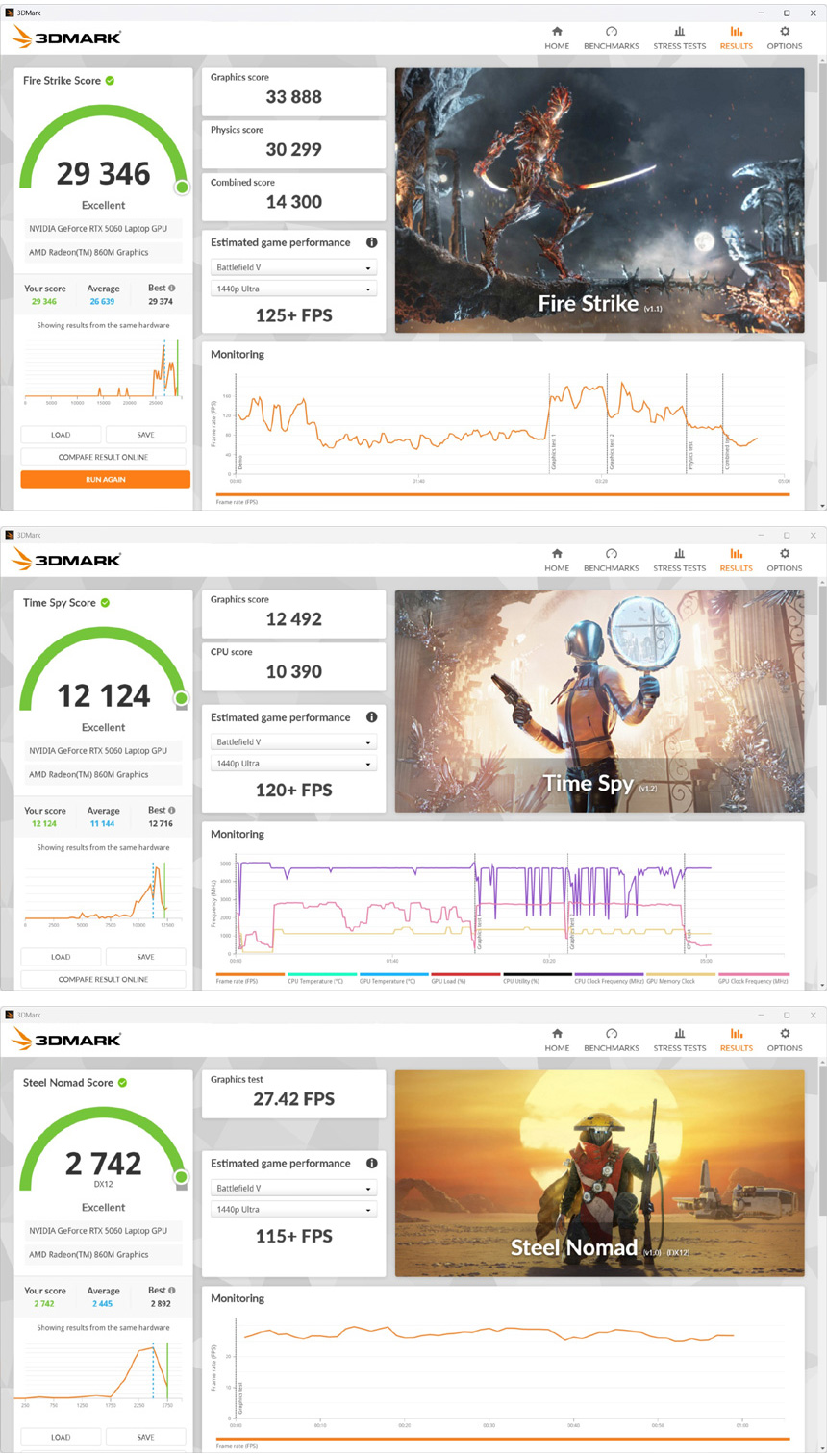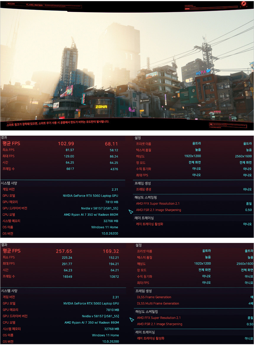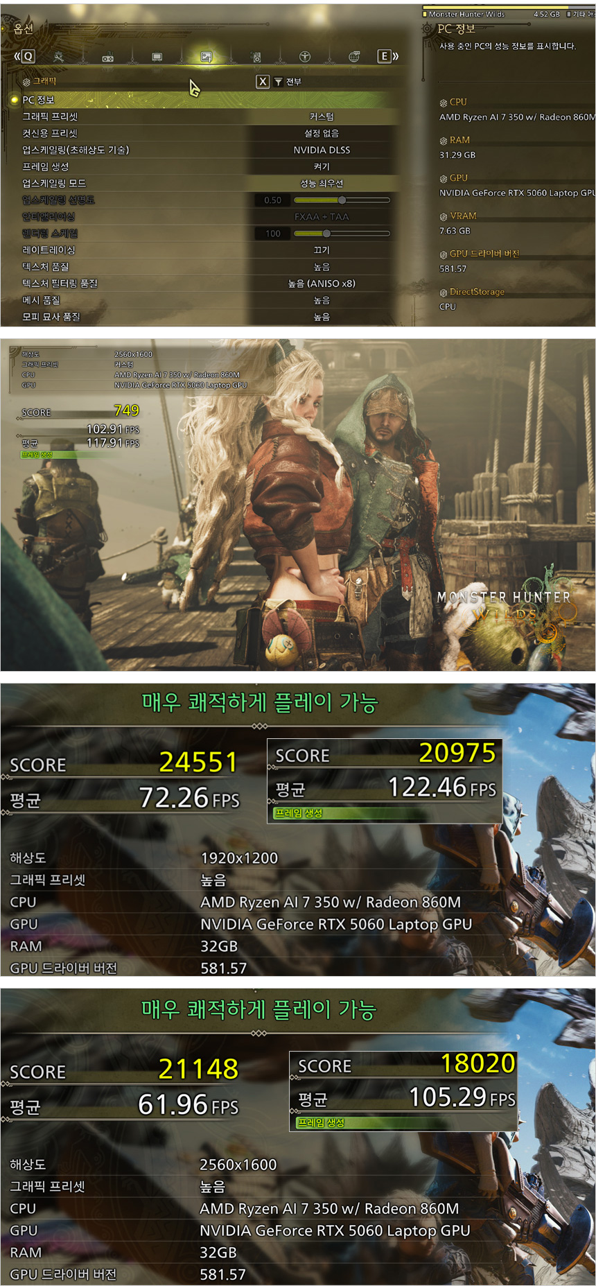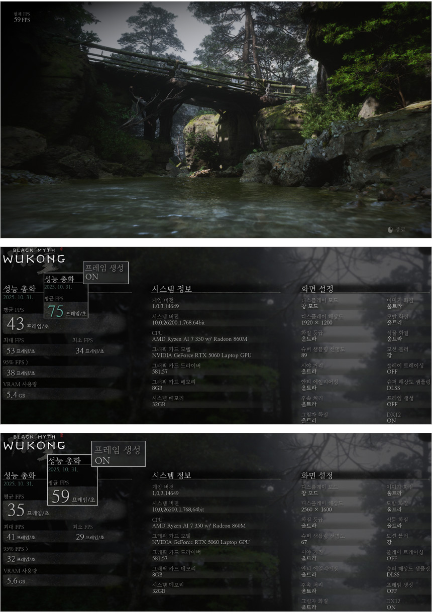 최신 게임을 상위 옵션에서 즐기는데 부족함이 없는 강력한 성능을 보여주었다. 특히 1TB 대용량 SSD를 탑재해 게임 설치에 제한이 있는 512GB 지원 노트북들과 달리 편하게 많은 게임을 설치해 즐길 수 있었다. 물론 RTX 5060을 탑재해 DLSS 의 도움을 받아야 하긴 하지만 WQXGA 해상도에서도 프레임이 상당히 높아 불편없이 게임을 즐길 수 있을 것이다.