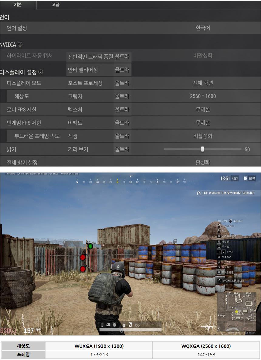 배틀그라운드를 플레이 하고 있는 모습으로 (연습모드) 울트라 옵션 설정시 WUXGA 에서는 200프레임에 근접하는 높은 성능을 보여주었으며 WQXGA 해상도에서는 100프레임 중반대로 플레이 되었다. (국민옵션 등을 적용해 프레임을 최대로 확보하기 바란다.)