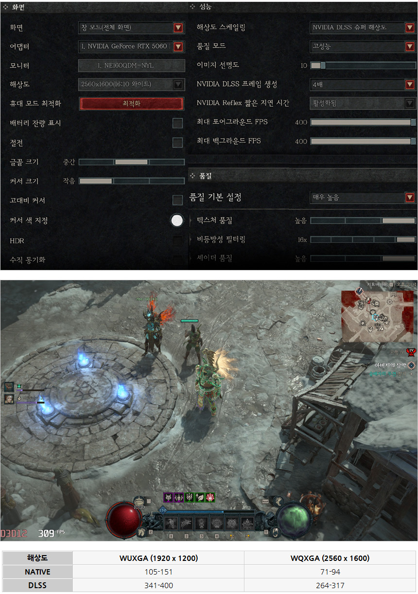 디아블로 4를 매우 높음 옵션으로 플레이 하고 있는 모습으로 DLSS를 활성화 하면 프레임이 확연하게 높아지기 때문에 DLSS를 사용하고 프레임을 생성해 게임을 즐기기 바란다. (프레임 생성을 활성화 하면 WQXGA 에서도 여유롭게 180Hz 주사율을 활용할 수 있다.)