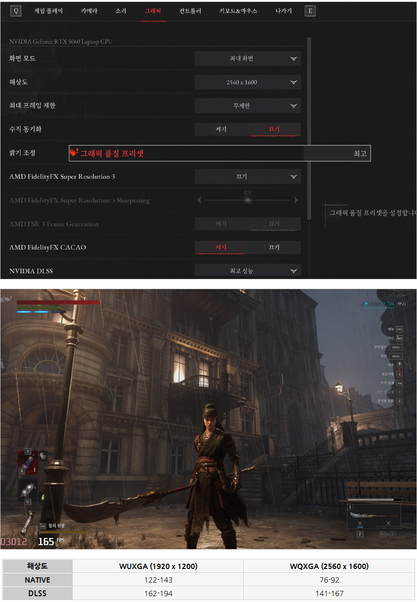 P의 거짓을 최고 옵션에서 플레이 하고 있는 모습으로 DLSS를 활성화 하면 프레임이 확연히 높아져 (특히 WQXGA) 부드럽게 게임을 즐길 수 있었다.
