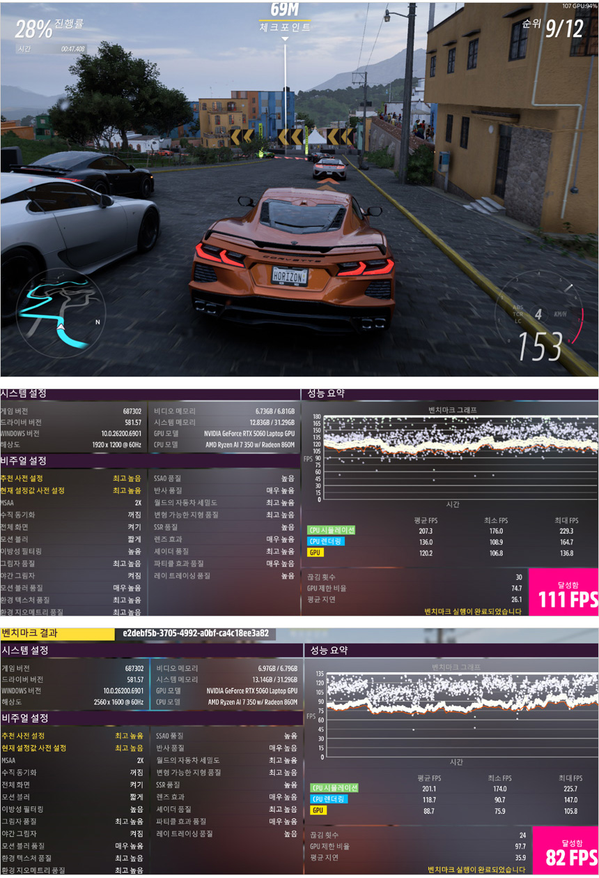 포르자 호라이즌 5를 최고 옵션으로 설정해 실행한 모습으로 WQXGA 해상도에서도 높은 프레임을 보여주었다. 해상도나 옵션에 상관없이 부드럽게 게임을 즐길 수 있을 것이다. (DLSS를 사용하면 더 부드럽게 게임을 즐길 수 있다.)