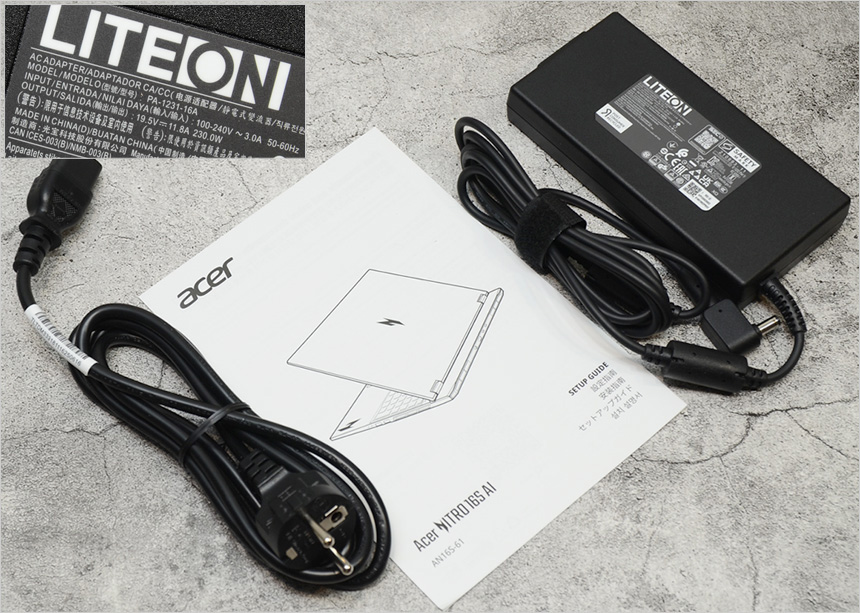 액세서리의 모습으로 230W 전원 어댑터와 전원 케이블을 비롯해 퀵 매뉴얼이 포함된 것을 확인할 수 있다.